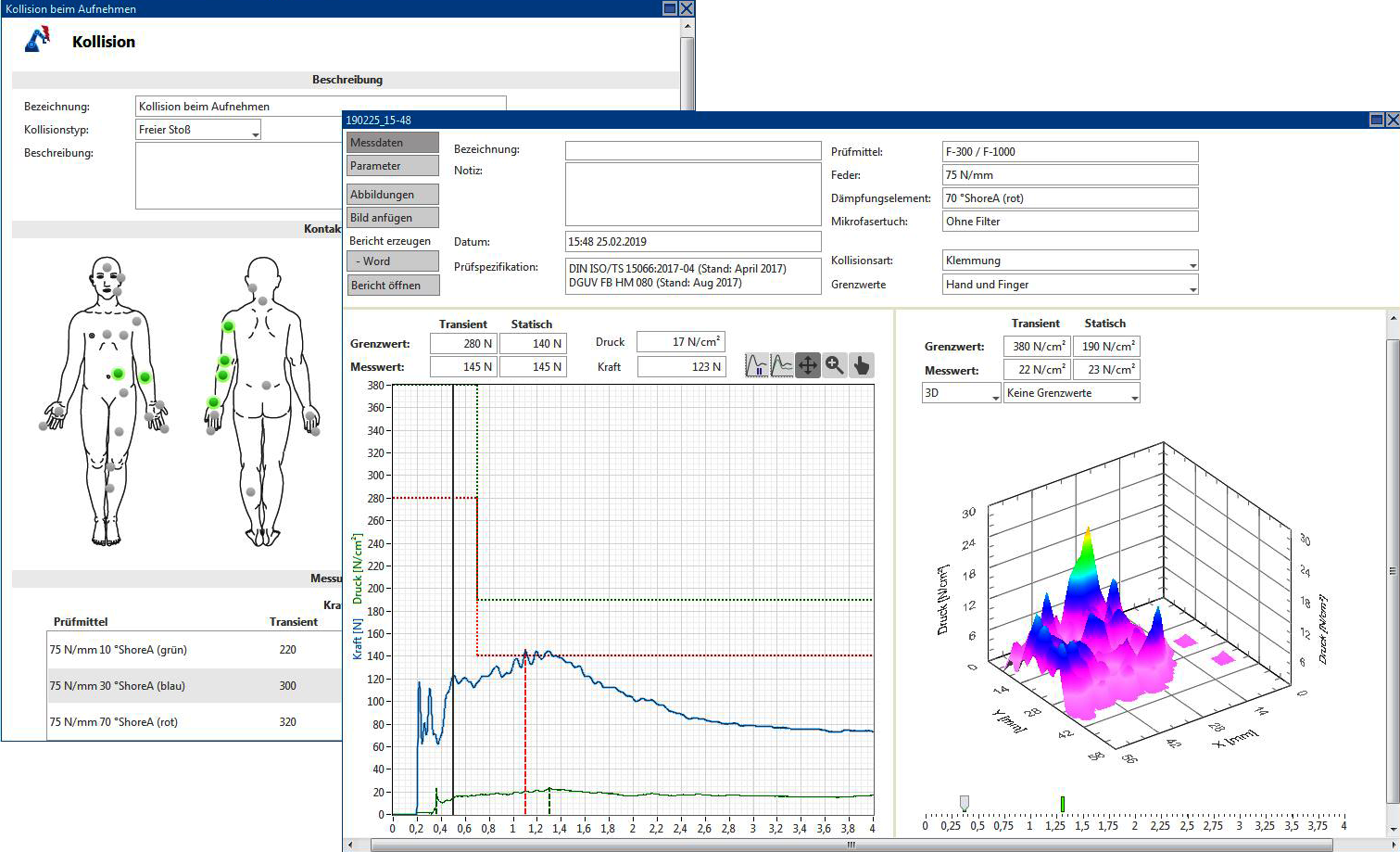CoboSafe デバイスで取得した力・圧力測定の結果は、Windowsベースの評価ソフトウェア CoboSafe-Vision 上で容易に解析可能です。本ソフトウェアは、測定カーブのグラフ表示を含む詳細なレポートを自動生成します。